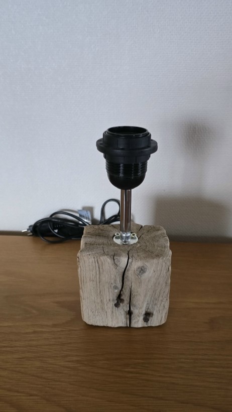 Lampe de chevet en bois flotté, il s’agit d’un dé de palette trouvé en Corse (maintenant les dés ne sont plus en bois mais en aggloméré)